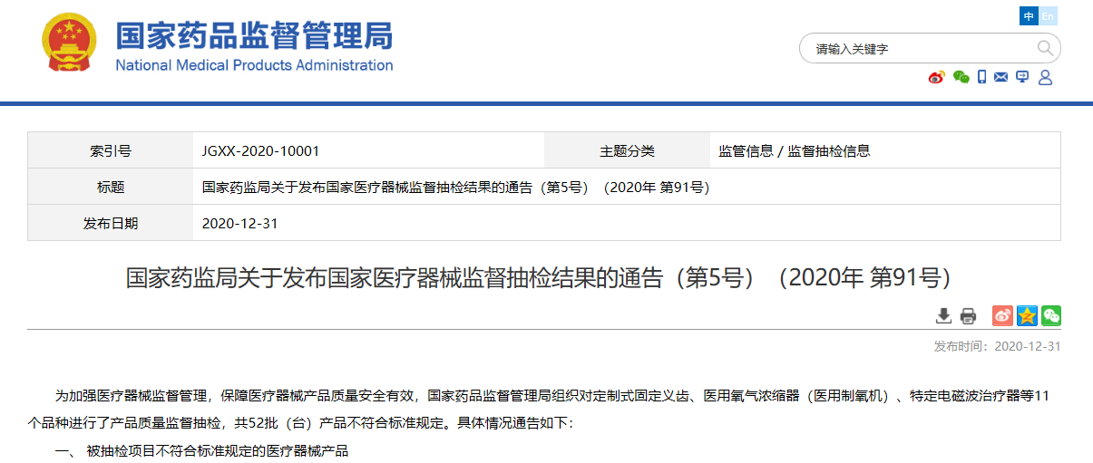 關于發布國家醫療器械監督抽檢結果的通告(第5號)(2020年 第91號)