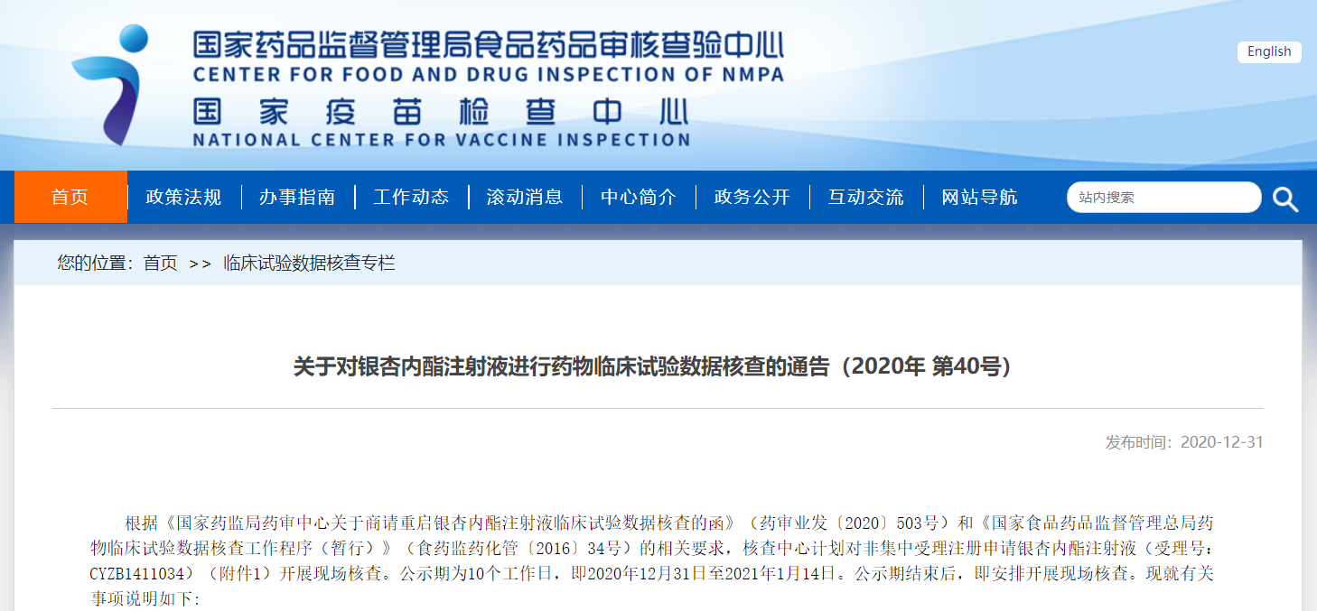 關于對銀杏內酯注射液進行藥物臨床試驗數據核查的通告(2020年 第40號)