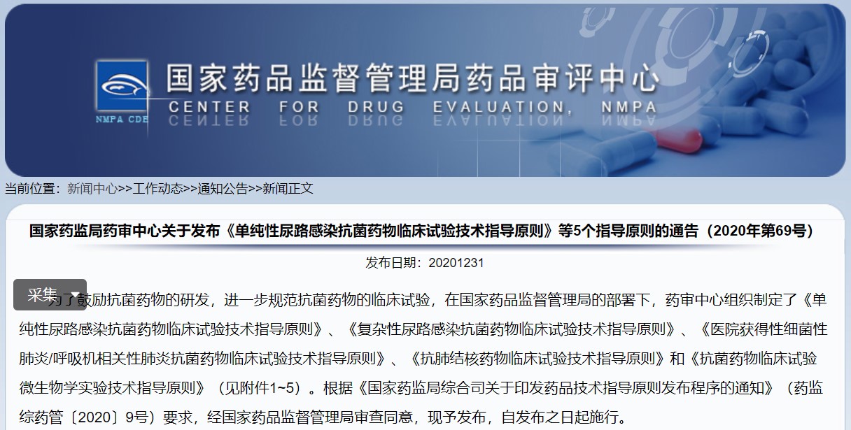 關于發布《單純性尿路感染抗菌藥物臨床試驗技術指導原則》等5個指導原則的通告(2020年第69號)