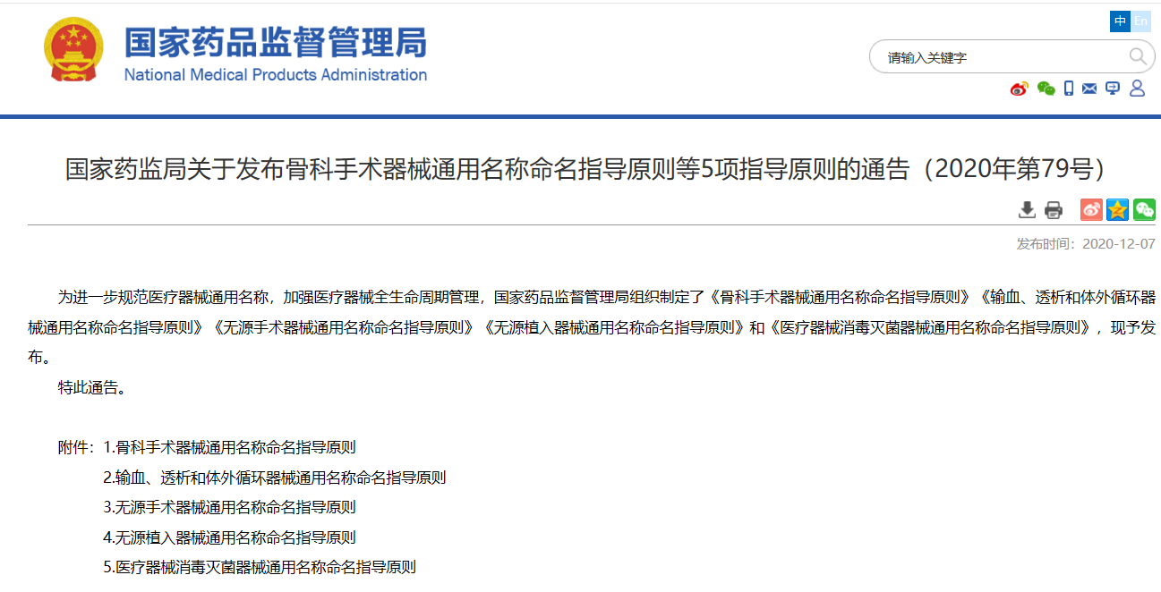為進一步規范醫療器械通用名稱,加強醫療器械全生命周期管理,國家藥品監督管理局組織制定并發布《骨科手術器械通用名稱命名指導原則》《輸血、透析和體外循環器械通用名稱命名指導原則》《無源手術器械通用名稱命名指導原則》《無源植入器械通用名稱命名指導原則》和《醫療器械消毒滅菌器械通用名稱命名指導原則》。