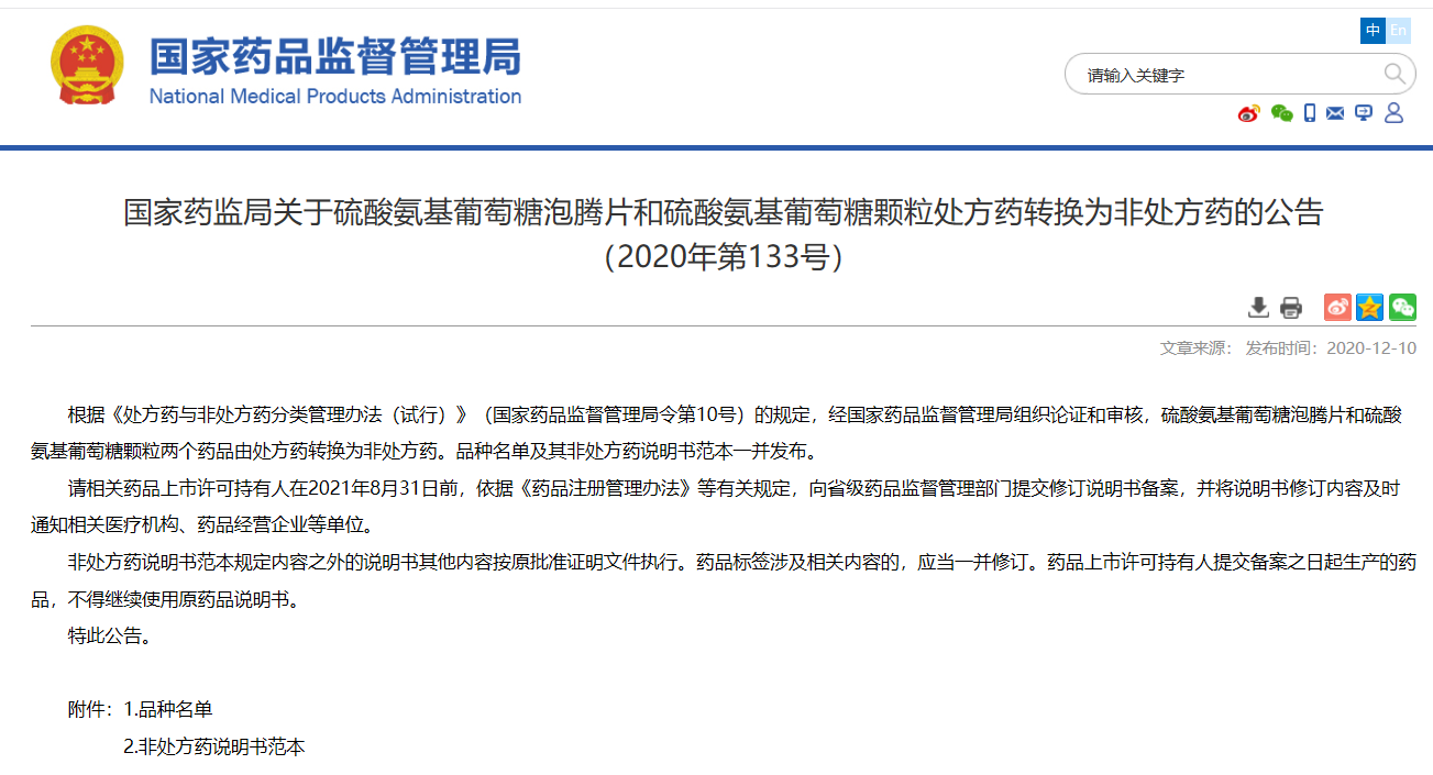 關于硫酸氨基葡萄糖泡騰片和硫酸氨基葡萄糖顆粒處方藥轉換為非處方藥的公告(2020年第133號)