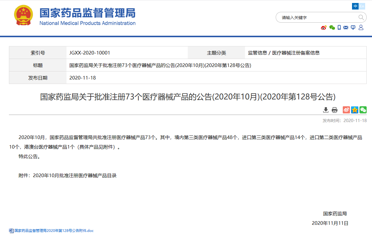 國家藥監局關于批準注冊73個醫療器械產品的公告(2020年10月)(2020年第128號公告)