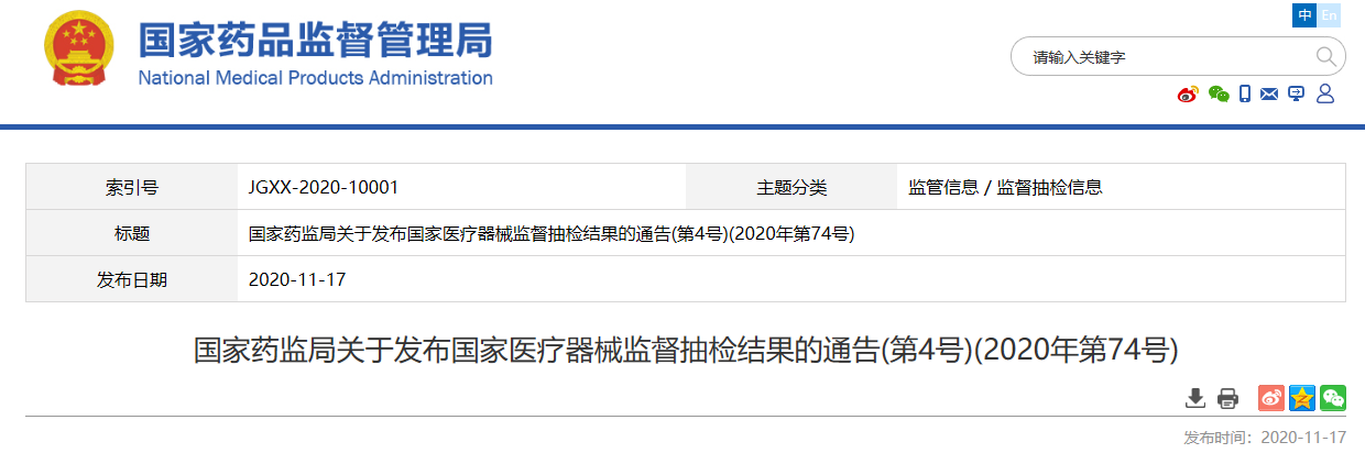 國家藥監局關于發布國家醫療器械監督抽檢結果的通告(第4號)(2020年第74號)