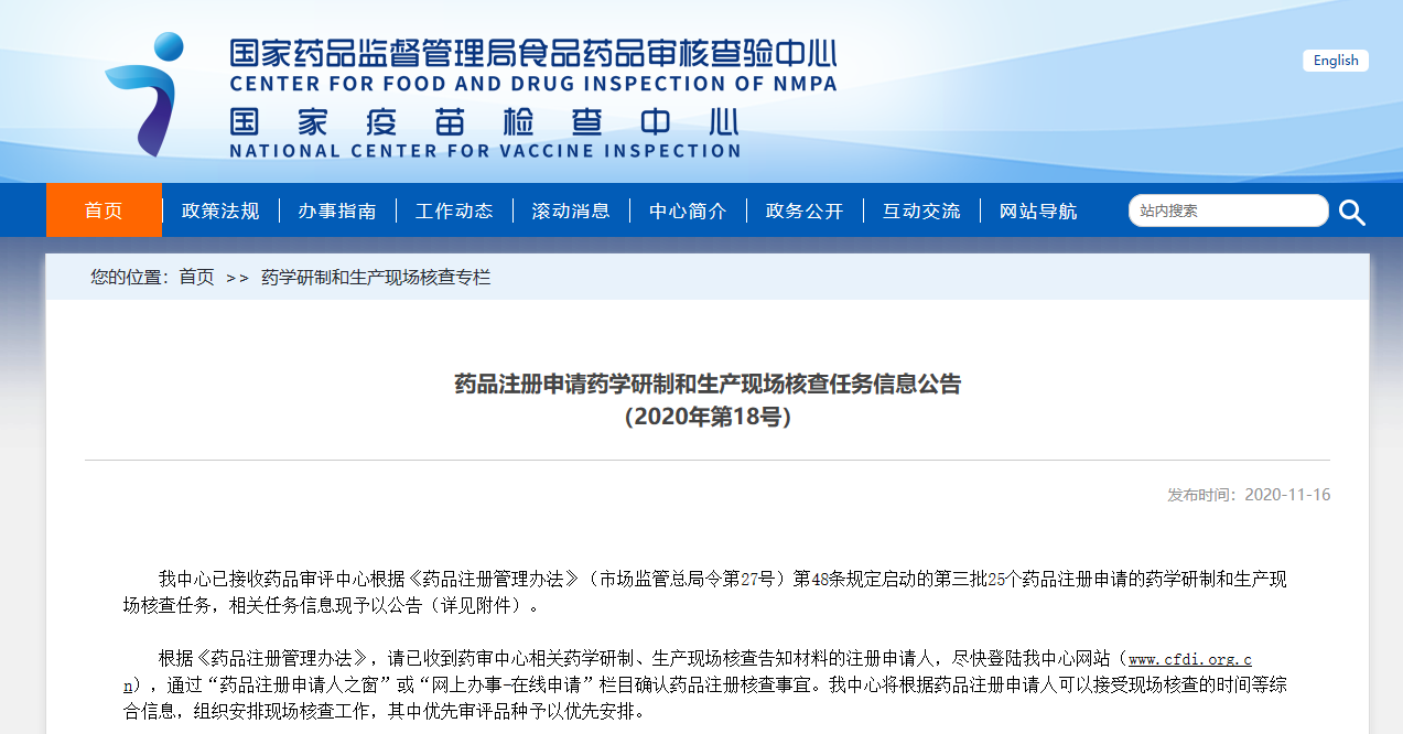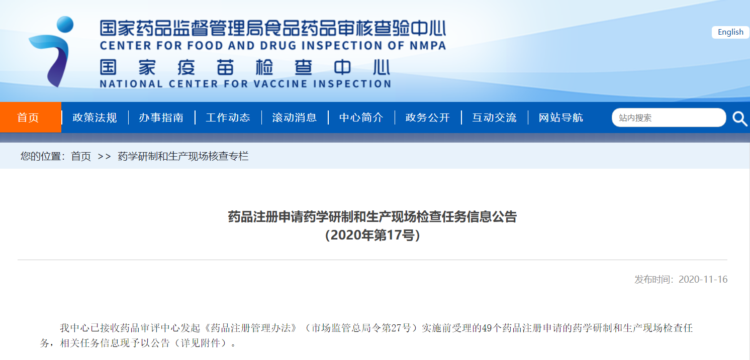 藥品注冊申請藥學研制和生產現場檢查任務信息公告