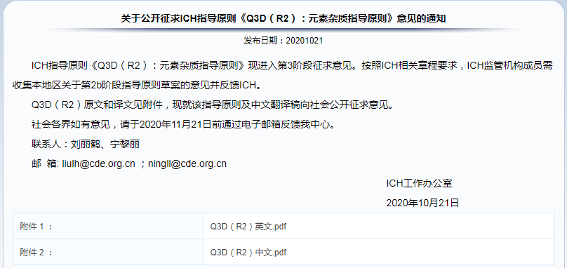 ? 關于公開征求ICH指導原則《Q3D(R2):元素雜質指導原則》意見的通知