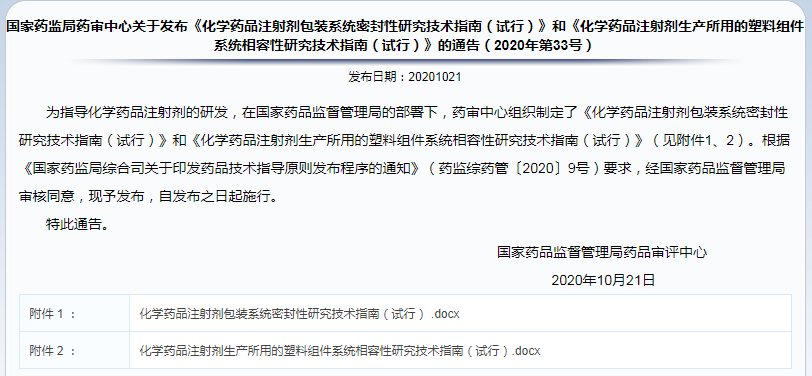 ? 國家藥監局藥審中心關于發布《化學藥品注射劑包裝系統密封性研究技術指南(試行)》和《化學藥品注射劑生產所用的塑料組件系統相容性研究技術指南(試行)》的通告(2020年第33號)