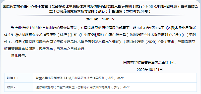 ? 國家藥監局藥審中心關于發布《鹽酸多柔比星脂質體注射液仿制藥研究技術指導原則(試行)》和《注射用紫杉醇(白蛋白結合型)仿制藥研究技術指導原則(試行)》的通告(2020年第36號)