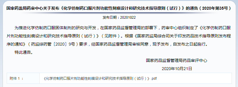 ? 國家藥監局藥審中心關于發布《化學仿制藥口服片劑功能性刻痕設計和研究技術指導原則(試行)》的通告(2020年第35號)
