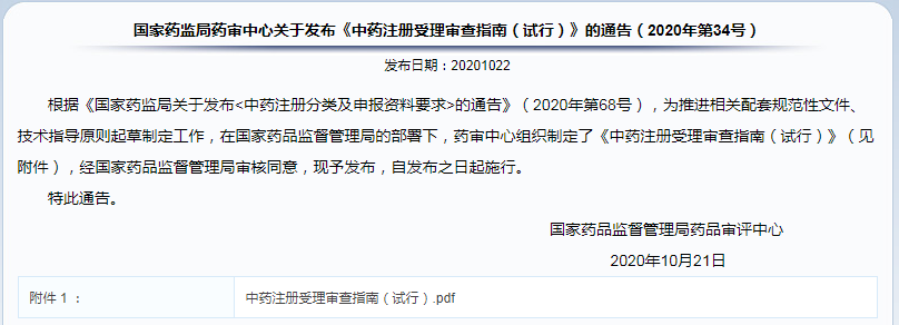 ? 國家藥監局藥審中心關于發布《中藥注冊受理審查指南(試行)》的通告(2020年第34號)