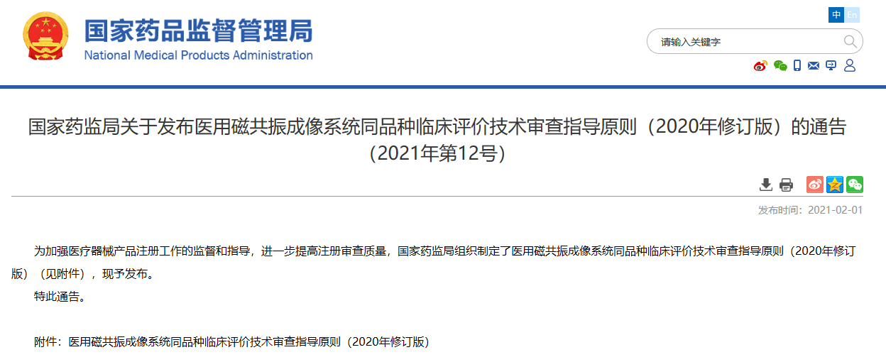 關于發布醫用磁共振成像系統同品種臨床評價技術審查指導原則(2020年修訂版)的通告(2021年第12號)