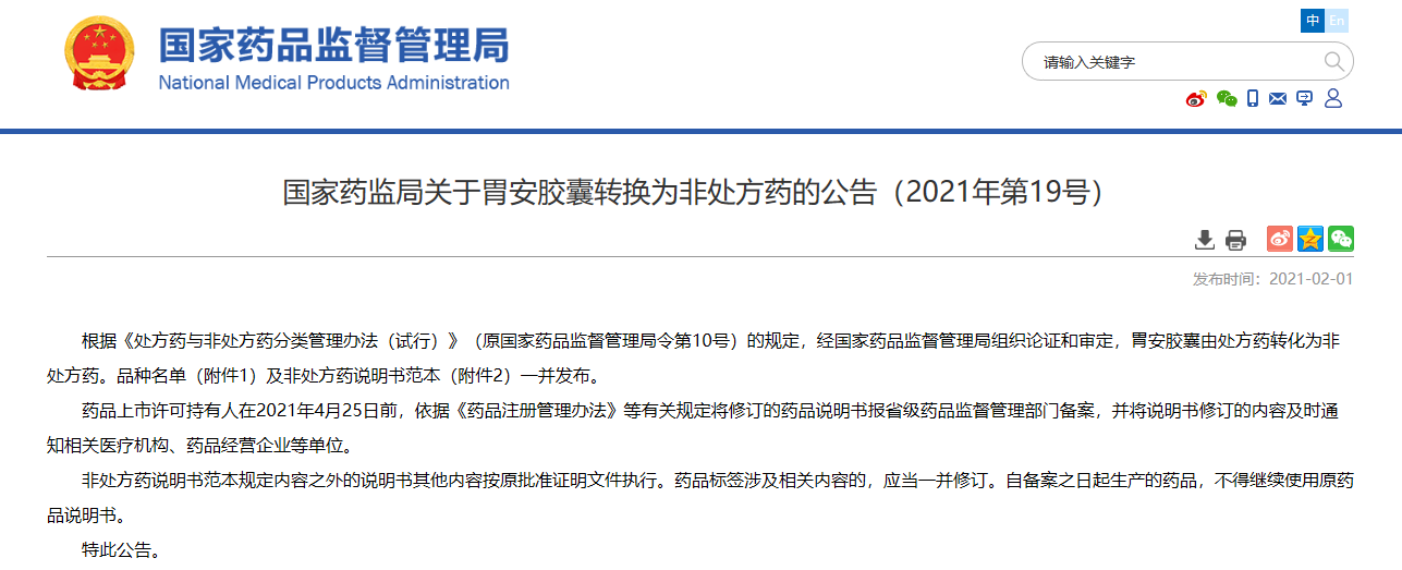 關于胃安膠囊轉換為非處方藥的公告(2021年第19號)