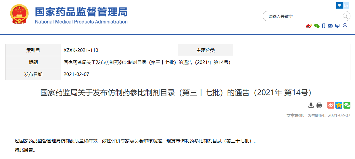 關于發布仿制藥參比制劑目錄(第三十七批)的通告(2021年 第14號)