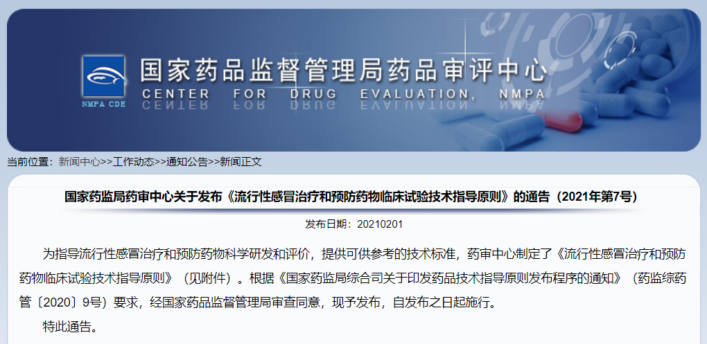 關于發布《流行性感冒治療和預防藥物臨床試驗技術指導原則》的通告(2021年第7號)