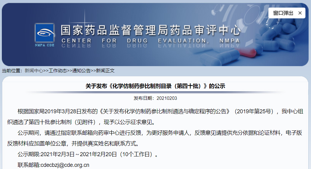 關于發布《化學仿制藥參比制劑目錄(第四十批)》的公示