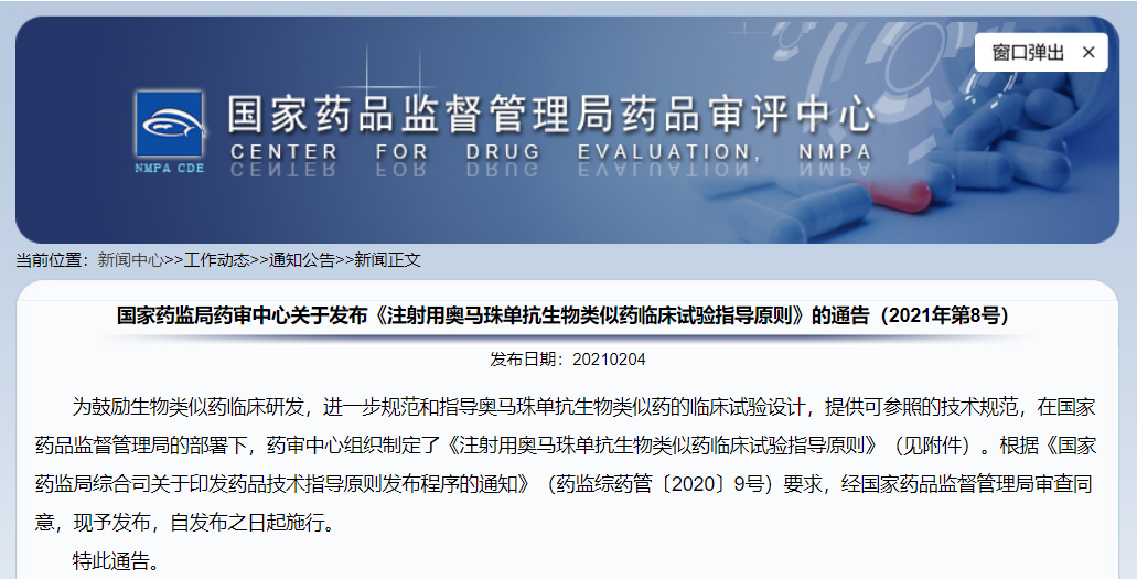 關于發布《注射用奧馬珠單抗生物類似藥臨床試驗指導原則》的通告(2021年第8號)