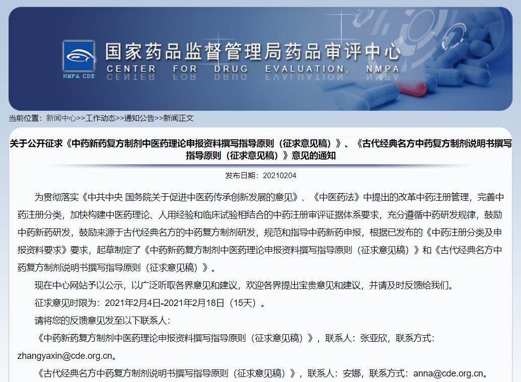 關于公開征求《中藥新藥復方制劑中醫藥理論申報資料撰寫指導原則(征求意見稿)》、《古代經典名方中藥復方制劑說明書撰寫指導原則(征求意見稿)》意見的通知