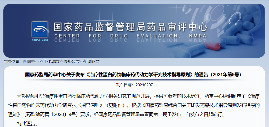 關于發布《治療性蛋白藥物臨床藥代動力學研究技術指導原則》的通告(2021年第9號)