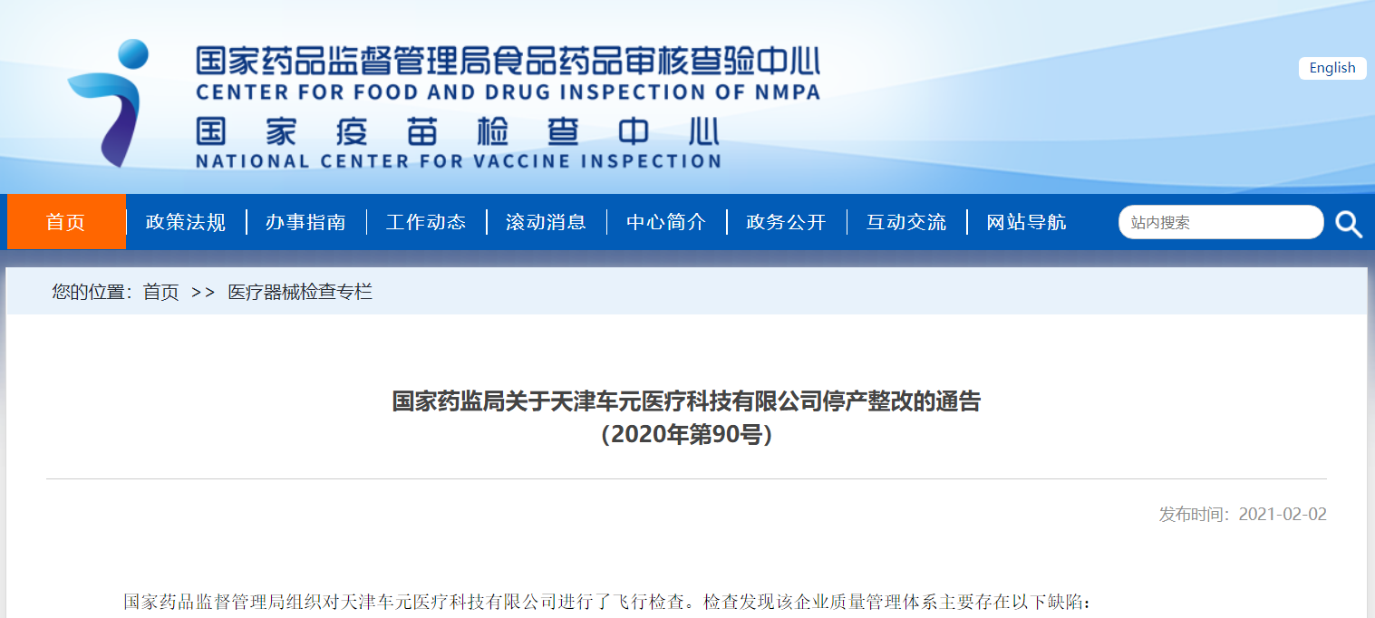 關于天津車元醫療科技有限公司停產整改的通告(2020年第90號)