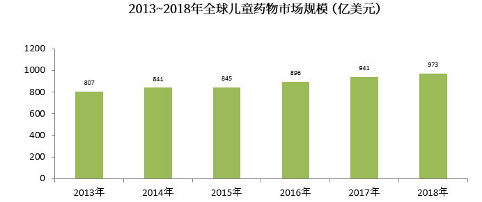 2013年~2018年全球兒童藥物市場規模呈逐年上升趨勢,近5年復合增長率(CAGR)為3.76%,2018年全球兒童藥物市場規模約為973億美元。