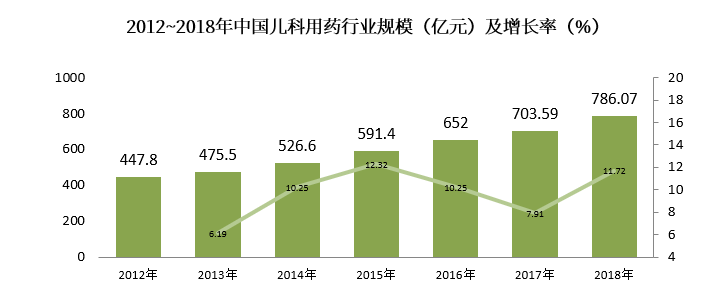 國內市場兒童藥物規模與國際市場相匹配,2012年~2018年CAGR為+9.83%,2018年我國兒科用藥市場規模約為786.07億元,較上年同比增長11.72%,國內兒科用藥市場規模增長迅速。