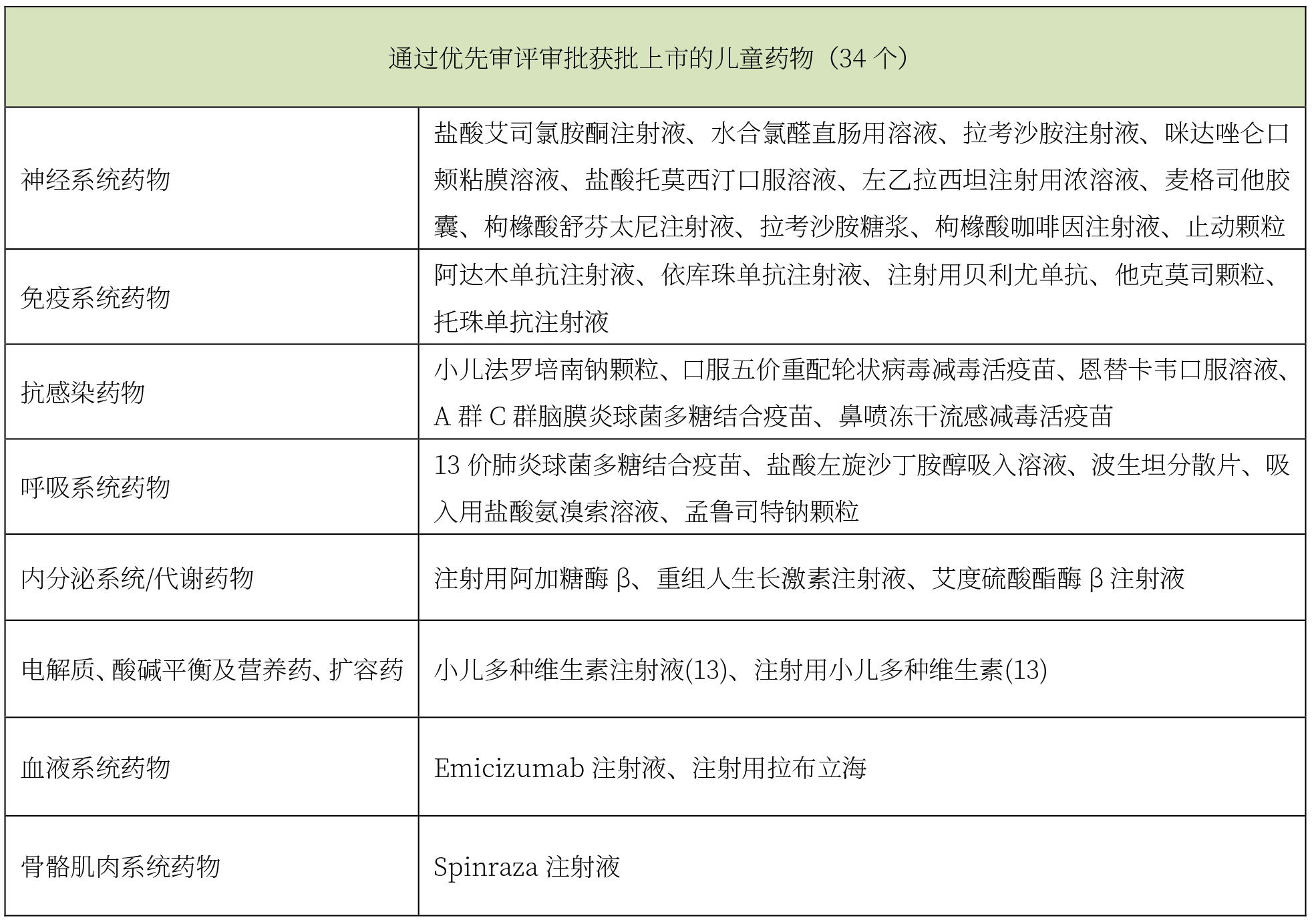 在兒童藥物優先審評審批方面,2016-2019年國家局已陸續將989個品種納入優先審評程序中,其中兒童藥物96件(占比為9.7%),已有80多個企業享受優惠政策。截至目前,通過兒童用藥優先審評審批上市的產品共計34個,詳見下表。