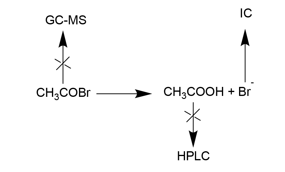檢測難點:起初使用氣質法對殘留試劑乙酰溴直接進行檢測,但是靈敏度不達要求??紤]到乙酰溴極易水解,水解后可以檢測生成的乙酸,即可達到定量檢測乙酰溴的目的。但是,通過嘗試我們發現,因乙酰溴為遺傳毒性雜質,其限度很低,即使使用高端儀器仍無法解決乙酸檢測靈敏度低的問題。