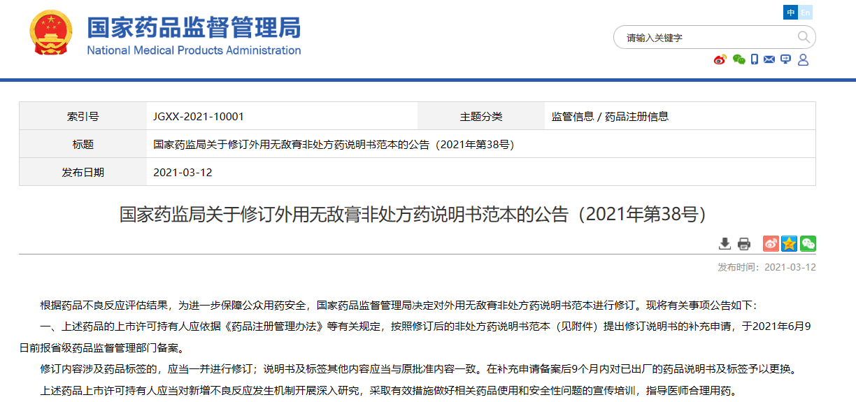 國家藥監局關于修訂外用無敵膏非處方藥說明書范本的公告(2021年第38號)
