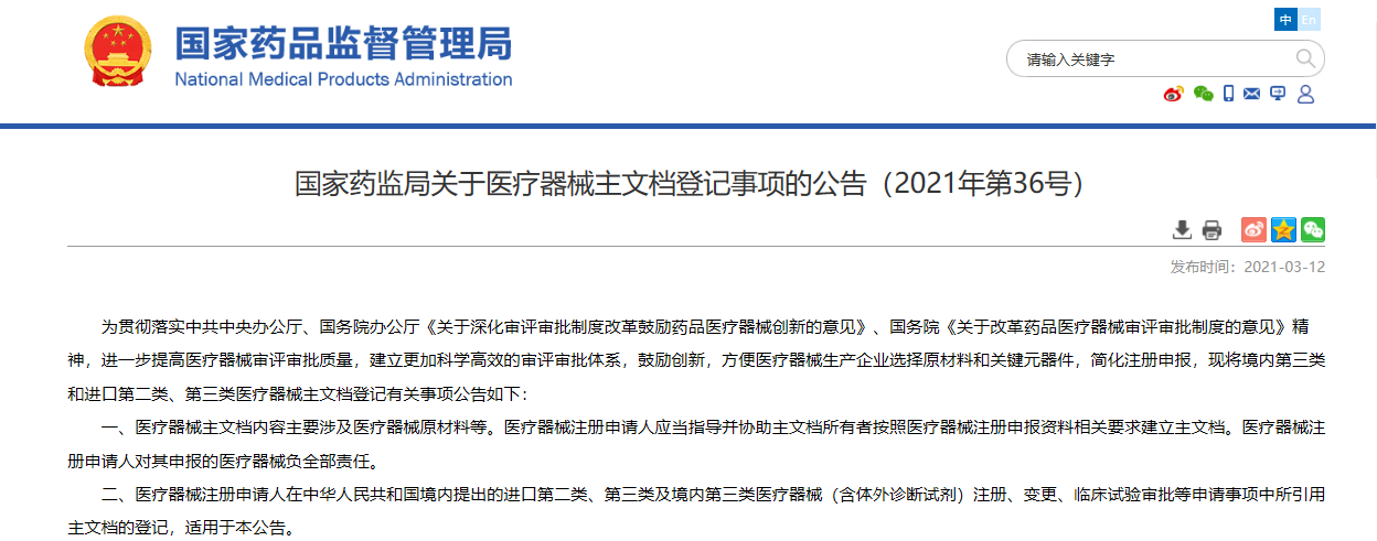 國家藥監局關于醫療器械主文檔登記事項的公告(2021年第36號)