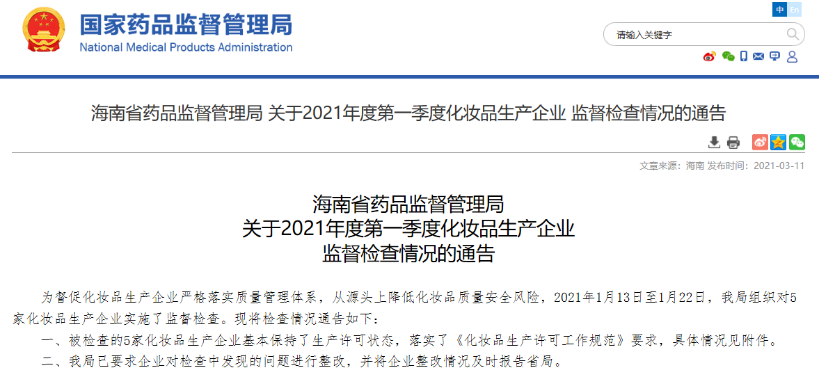 海南省藥品監督管理局 關于2021年度第一季度化妝品生產企業 監督檢查情況的通告