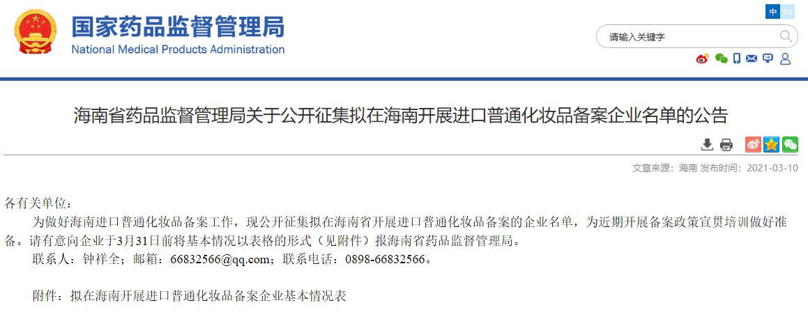 海南省藥品監督管理局關于公開征集擬在海南開展進口普通化妝品備案企業名單的公告
