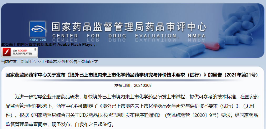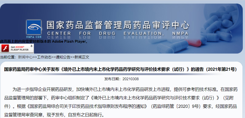 國家藥監局藥審中心關于發布《境外已上市境內未上市化學藥品藥學研究與評價技術要求(試行)》的通告(2021年第21號)