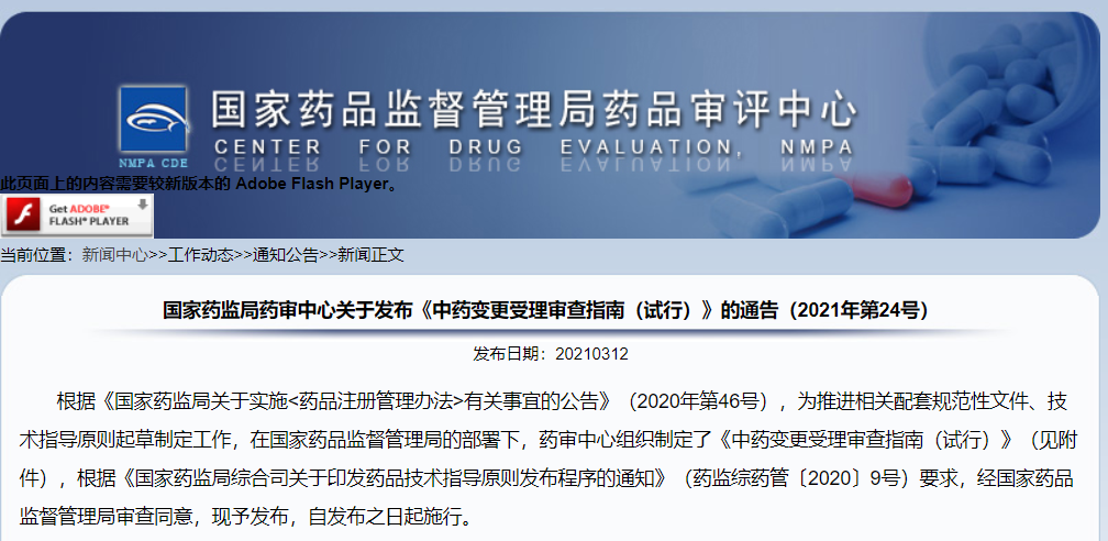 國家藥監局藥審中心關于發布《中藥變更受理審查指南(試行)》的通告(2021年第24號)