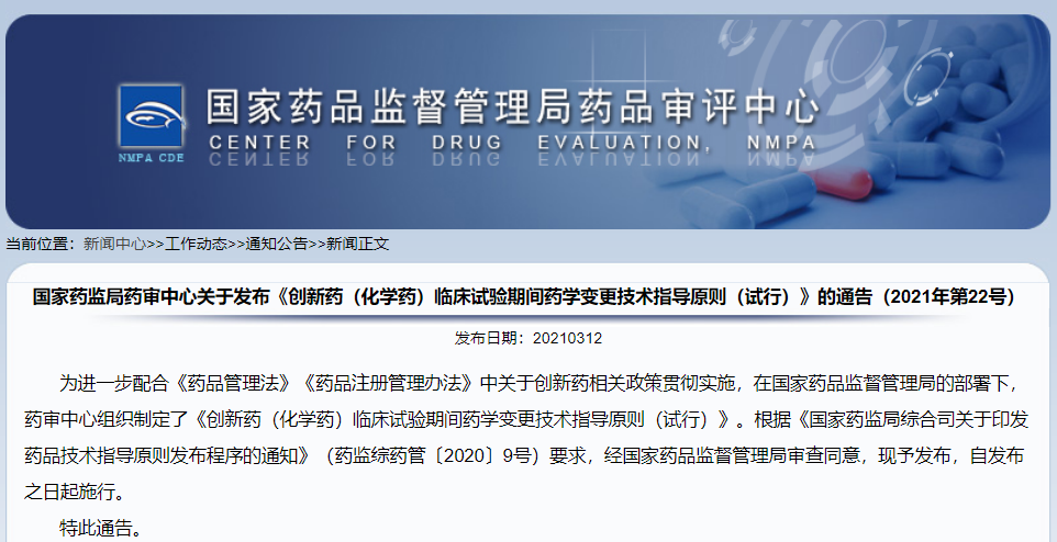 關(guān)于發(fā)布《創(chuàng)新藥(化學(xué)藥)臨床試驗期間藥學(xué)變更技術(shù)指導(dǎo)原則(試行)》的通告(2021年第22號)
