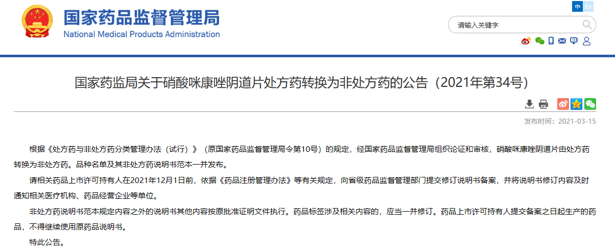 關(guān)于硝酸咪康唑陰道片處方藥轉(zhuǎn)換為非處方藥的公告(2021年第34號)