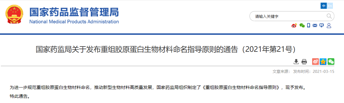 關(guān)于發(fā)布重組膠原蛋白生物材料命名指導(dǎo)原則的通告(2021年第21號)