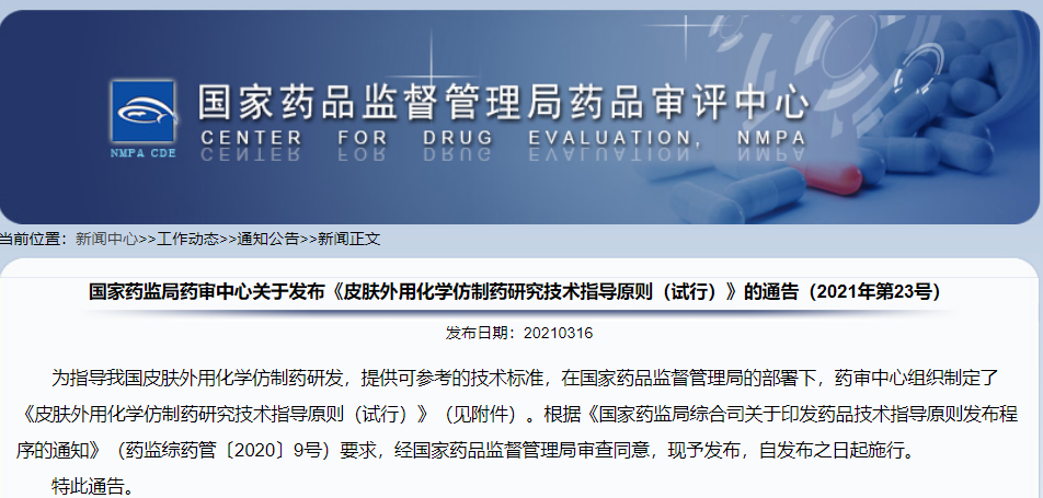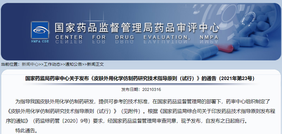 關(guān)于發(fā)布《皮膚外用化學(xué)仿制藥研究技術(shù)指導(dǎo)原則(試行)》的通告(2021年第23號)