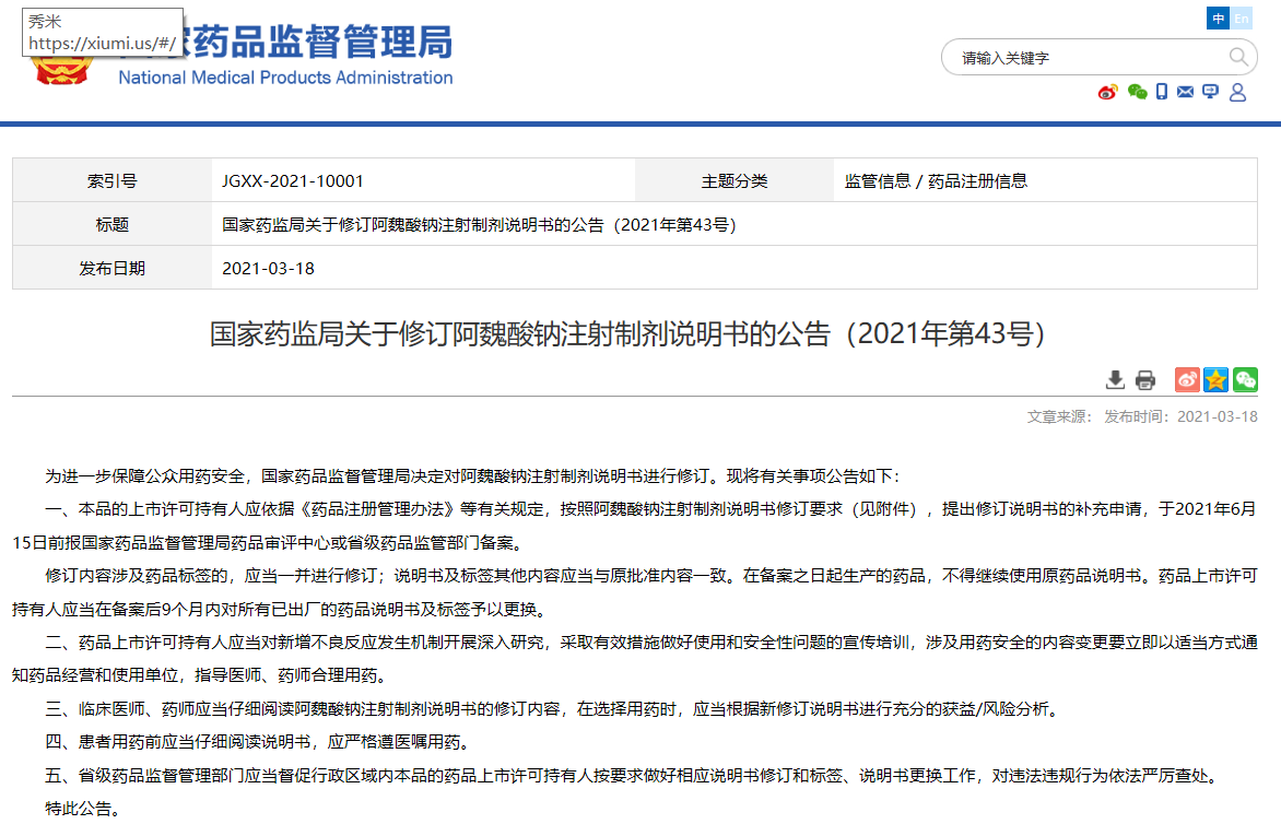 關(guān)于修訂阿魏酸鈉注射制劑說明書的公告(2021年第43號)