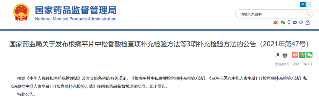 國家藥監局關于發布根痛平片中松香酸檢查項補充檢驗方法等3項補充檢驗方法的公告(2021年第47號)