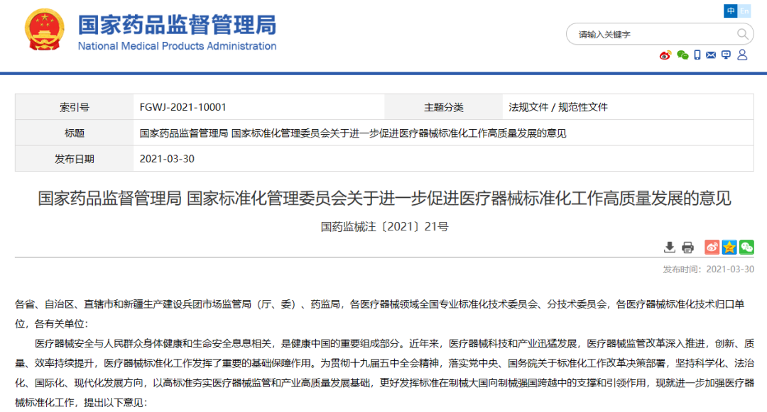 國家藥品監督管理局 國家標準化管理委員會關于進一步促進醫療器械標準化工作高質量發展的意見(2021-03-30)