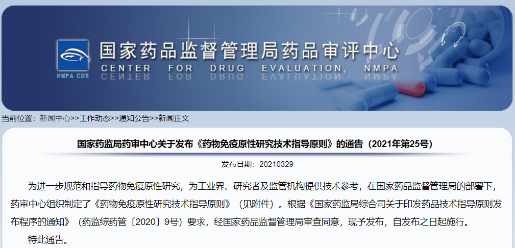 國家藥監局藥審中心關于發布《藥物免疫原性研究技術指導原則》的通告(2021年第25號)