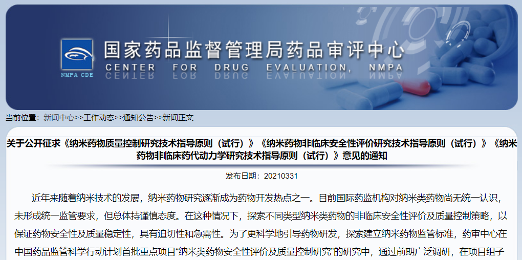 關于公開征求《納米藥物質量控制研究技術指導原則(試行)》《納米藥物非臨床安全性評價研究技術指導原則(試行)》《納米藥物非臨床藥代動力學研究技術指導原則(試行)》意見的通知(2021-03-31)