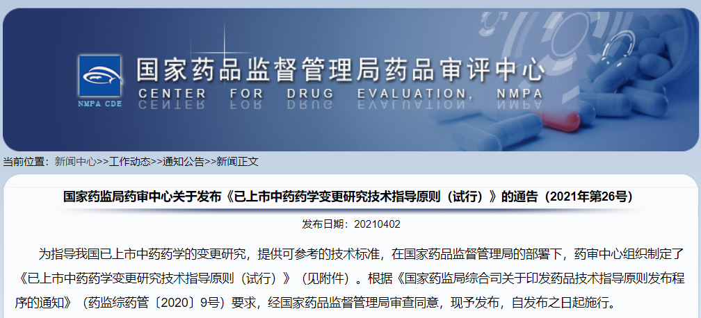 國家藥監局藥審中心關于發布《已上市中藥藥學變更研究技術指導原則(試行)》的通告(2021年第26號)