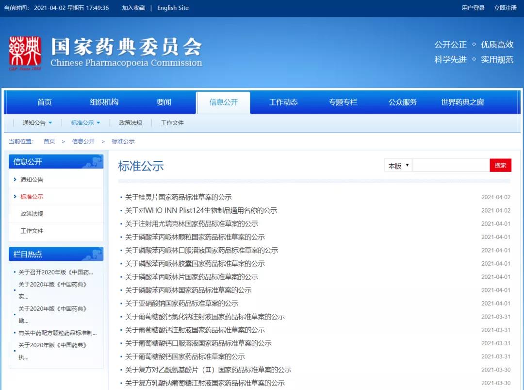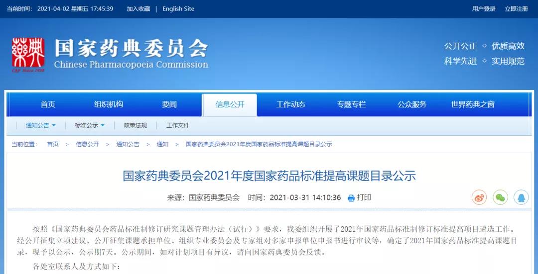 國家藥典委員會2021年度國家藥品標準提高課題目錄公示(2021-03-31)