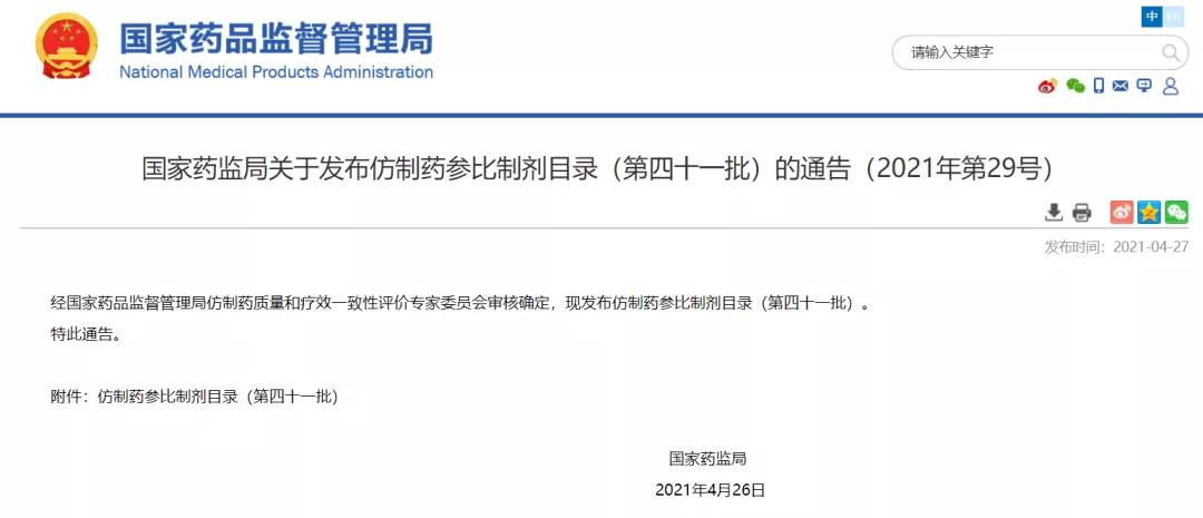 國家藥監局關于發布仿制藥參比制劑目錄(第四十一批)的通告(2021年第29號)