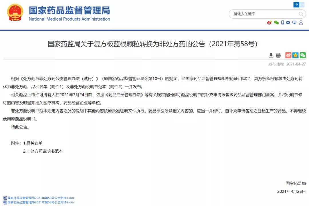 國家藥監局關于復方板藍根顆粒轉換為非處方藥的公告(2021年第58號)