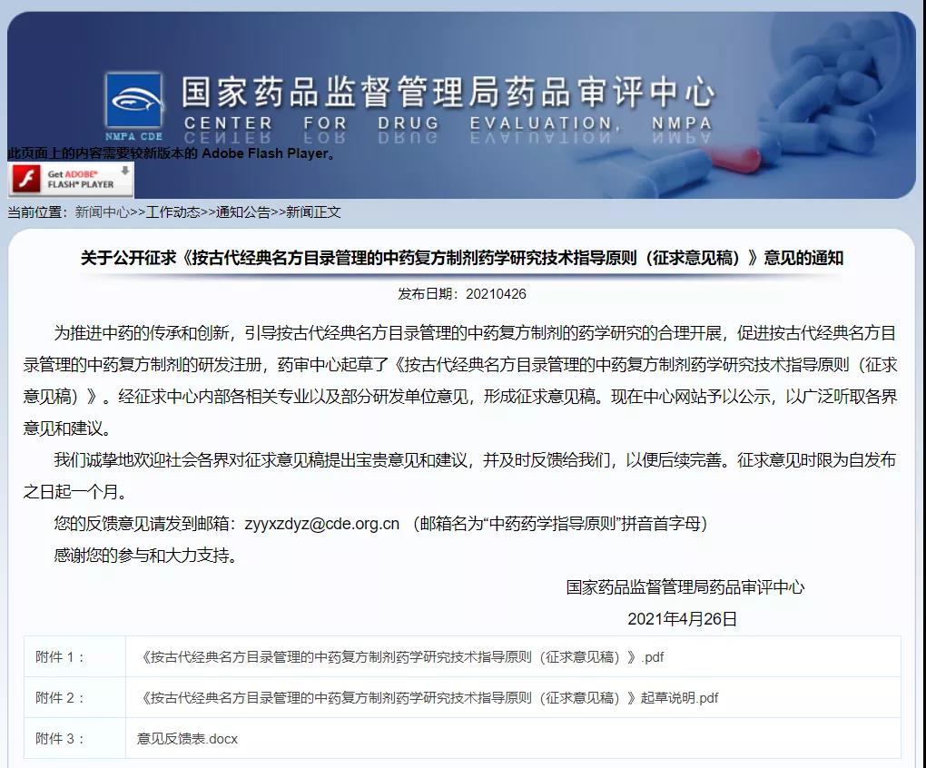 關于公開征求《按古代經典名方目錄管理的中藥復方制劑藥學研究技術指導原則(征求意見稿)》意見的通知