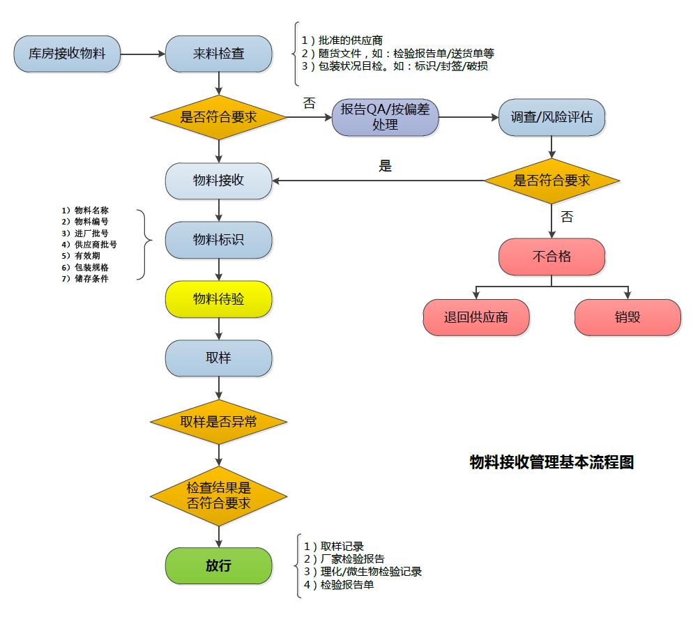 物料接收包括物料從入庫到存放、取樣、檢驗、放行的全過程, 著重說明物料接收的步驟、檢查內容和注意事項。