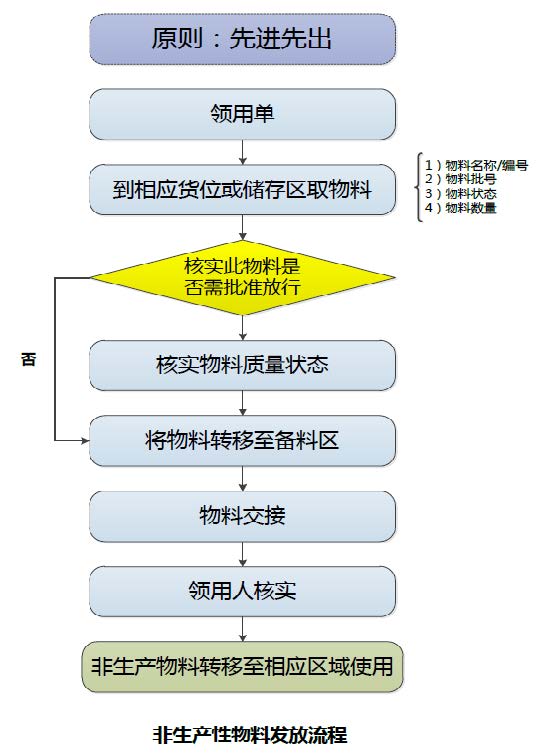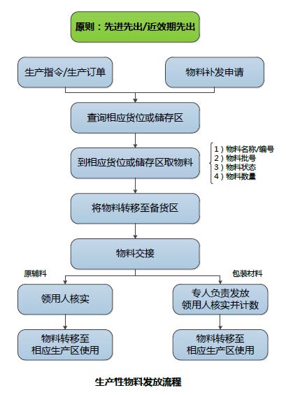 建立生產物料發放管理程序;物料按批發放使用;只有經放行并有合格狀態標識的物料方可發放;根據生產指令和/或物料提取單核對發放物料;發放生產物料時應檢查物料的外包裝情況。