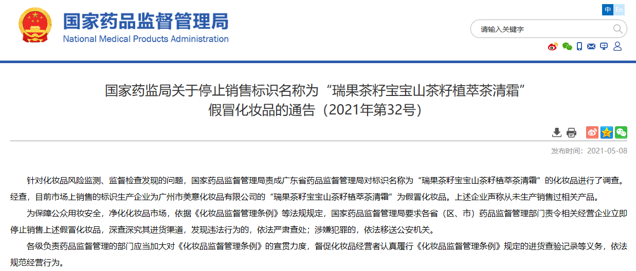 關(guān)于停止銷售標(biāo)識(shí)名稱為“瑞果茶籽寶寶山茶籽植萃茶清霜”假冒化妝品的通告(2021年第32號(hào))