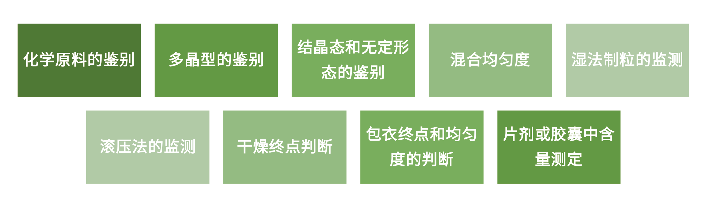 拉曼光譜在固體制劑生產中的應用包括:原料鑒別、反應檢測和多晶型篩選。為了通過在線或者離線的測量方式達到實時反映工藝過程的目的,分析技術要達到過程監測目的還要求具有如下特點: